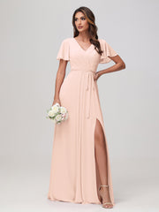 Flatterärmel Rüschen Chiffon Kleid mit Gürtel Perlrosa